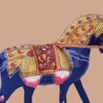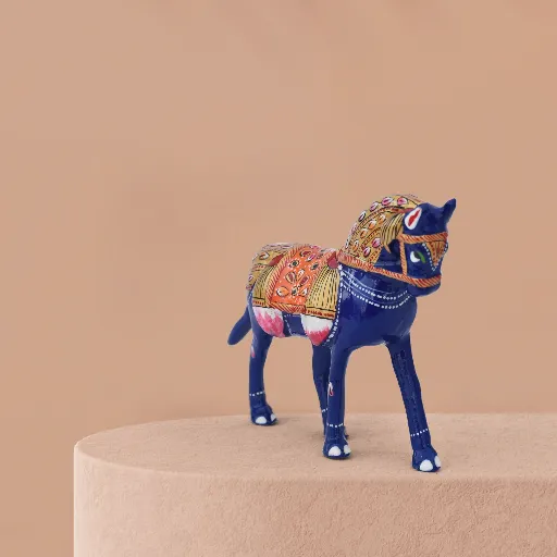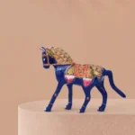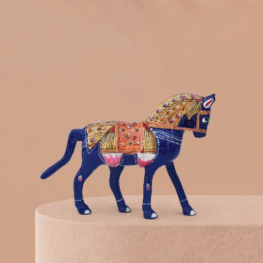 This handcrafted decorative horse figurine stands out with its vivid hand‑painted accents in gold, orange, red, and white. The saddle is richly adorned in orange and gold, featuring a prominent central floral Meenakari motifs