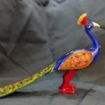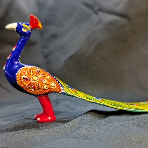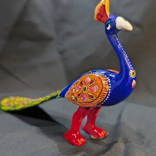 Slender hand-painted peacock figurine featuring a sleek, elegant body with a contrasting crest and sturdy legs. The wing is adorned with a teardrop-shaped panel highlighted by intricate decorative patterns and a central motif, surrounded by smaller petal-inspired details for an artistic finish.