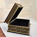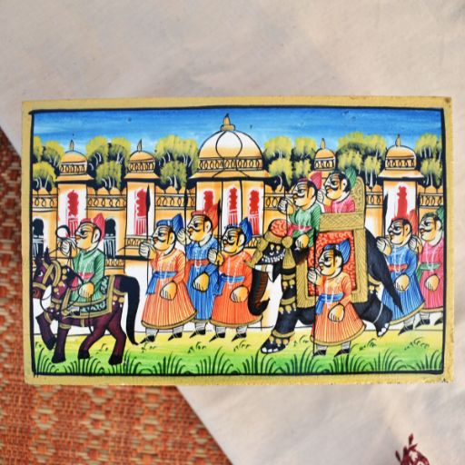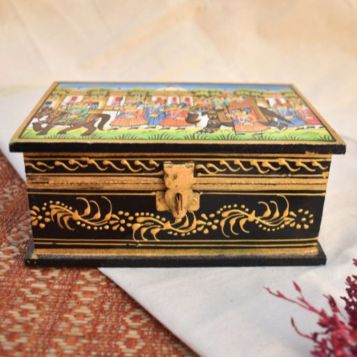 Celebrate the elegance of Indian artistry with this exquisite handcrafted wooden decorative box, adorned with a vibrant depiction of a royal procession. The lid features a hand-painted scene of regal splendour A spacious design that offers generous room for treasured items. Perfect as a statement piece or for organizing larger accessories along with a sturdy metal latch that secures the lid, making it ideal for storing jewellery, keepsakes, or gifting.