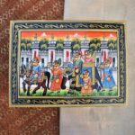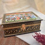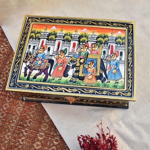 Celebrate the elegance of Indian artistry with this exquisite handcrafted wooden decorative box, adorned with a vibrant depiction of a royal procession. The lid features a hand-painted scene of regal splendour. This is a compact version ideal for storing small keepsakes along with a sturdy metal latch that secures the lid, making it ideal for storing jewellery, keepsakes, or gifting.